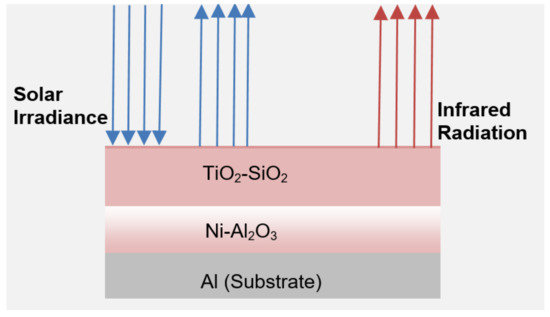 The schematic of the investigated double-layer coating design is shown in Figure 1. On the top, we find the super-hydrophilic TiO2-SiO2 composite. The self-cleaning layer TiO2-SiO2 is expected to reject visible and near-IR spectra. At the same time, the self-cleaning layer exhibits extremely low mid-infrared reflectance in order to reject the thermal radiation emitted by the top layer. The super-hydrophilic TiO2-SiO2 sol-gel is not absorptive in most of the solar spectra because of their intrinsic mid-infrared thermal emission properties [23]. The radiative cooling in our proposed cooler is assisted by the optical Tamm resonance structure (Ni-Al2O3) [24]. The Al2O3 embedded with a Ni nanoparticle at the bottom is designed to enhance high emissivity in the “atmospheric window” in order to evacuate mid-infrared radiation from the structure. High emissivity is reached for nickel–alumina composites with a nickel content varying from 60 to 80% [25]. The addition of Ni is known to stabilize Al2O3 for high-temperature applications and was also found to improve high mechanical resistance [26]. Transmission electron microscopy (TEM) study has shown that the Ni particle size is of the order of 5–10 nm [27,28]. The aggregate sizes are thus much smaller than the wavelength of the radiation in the solar and mid-infrared regions ().