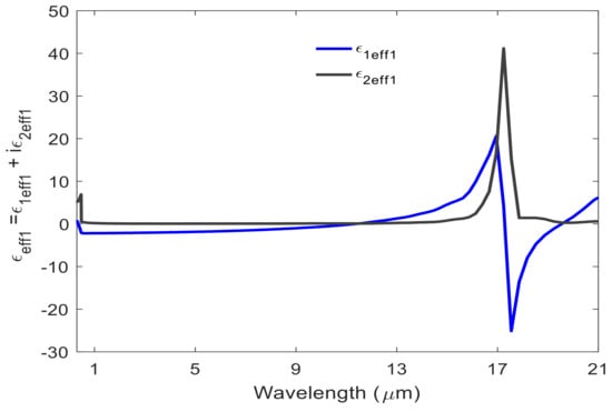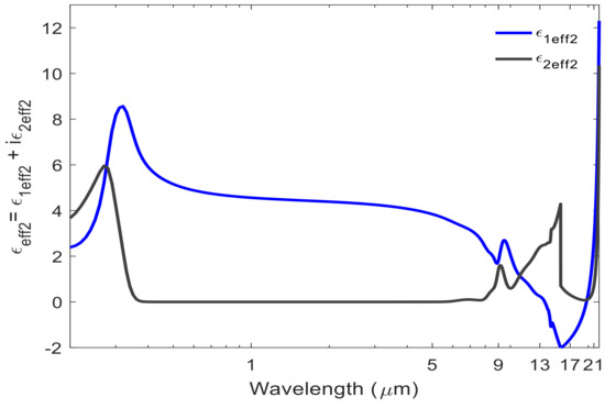 The real part and imaginary part of the dielectric constant of Ni-Al2O3 are shown in Figure 2. We note that the Nickel–alumina composite has phonon-polariton resonance optical absorptions at the far-IR window [30]. We observe that the second loss peak at micron is out of the primary far-IR atmosphere widow. The real part and imaginary part of the effective medium dielectric function of composite is shown in Figure 3. As shown in Figure 3, the real part and imaginary part decrease with decreasing wavelength from to implying dielectric behavior. We can observe an absorption bulge at due to bending vibration.
