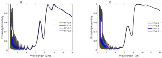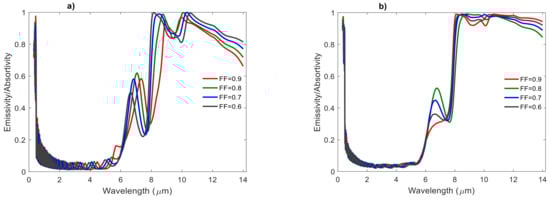 Although the goal of this section is to enhance the passive radiative cooling ability of the proposed design, the optimization of spectral properties at different filling ratios seems to be absolutely necessary, especially for designs with many layers. Thus, the optimized spectral emissivities of the double-layer nanoparticle-based coating are mainly related to filling the fraction and thickness of each layer. According to Kirchhoff’s law of thermal radiation [31], the spectral absorption equals the spectral emissivity at thermodynamic equilibrium. In order to investigate the filling ratio effect of TiO2-SiO2, we first fix the filling fraction of Ni-Al2O3 as . Figure 4 shows the emissivity/absorptivity spectrum at filling ratios from 0.6 to 0.9 of TiO2-SiO2 with a fixed filling ratio (FF = 0.8) of Ni-Al2O3 for normal and oblique incidences. It is evident that a clear relationship between the spectral emissivity profile and filling ratio of TiO2-SiO2 is observed. Notably, the low spectral emissivity profile in the wavelength from to does not change, while the intensity of the emissivity in the range from to changes with the increase in filling ratios for both normal and oblique incidences.
