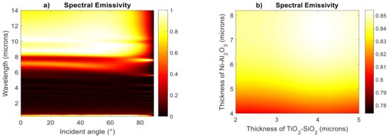 Figure 6 shows a contour plot of the spectral averaged emissivity for a simple coating selective emitter as a function of incident angle, wavelength, and thickness. As shown in Figure 6b, the maximum area can be 3.5–5 for the first cermet layer (SiO2-TiO2), and a range of 6–8