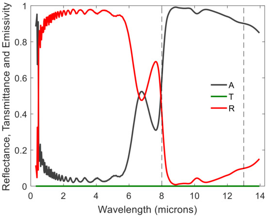 The spectral emittance, reflectance, and transmittance of the proposed emitter are shown in Figure 7. We note that the absorbed solar power of our structure remains well below . The proposed selective emitter is appropriate for both high solar reflectance and strong mid-infrared emissivity. The high reflectance of the simple coating emitter in the band is mainly due to the strong scattering effect of particles, which disappears progressively with the increase in wavelength. It was found that our proposed emitter exhibits good spectral selectivity from the solar region to mid-infrared spectrum. The high broadband emissivity achieved is mainly caused by the combination of the optical properties of each layer and interference effects.