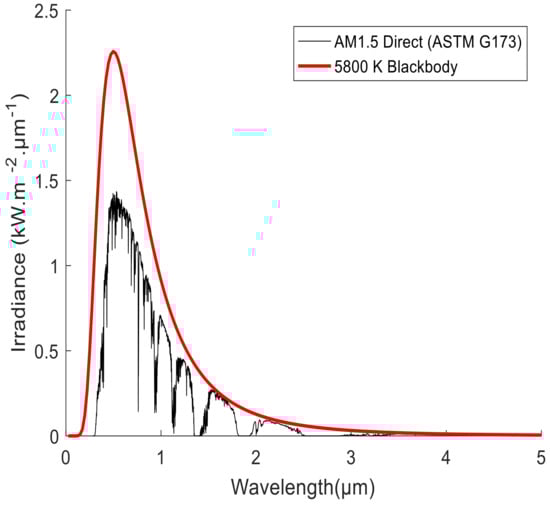 where is Planck’s constant, is the speed of light in a vacuum, is Boltzmann’s constant, and is the wavelength. The effect of solar irradiance is important for the evaluation of radiative cooling performance. is the spectrum distribution of solar irradiance. A solar spectral irradiance (ASTM-173) spectrum profile is shown in Figure 8 [32].