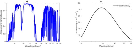 (a) The computed atmospheric transmittance spectrum, computed using Modtran/PcModWin model (shaded blue) and (b) the computed spectral irradiance of a black body at 300 K (shaded black).