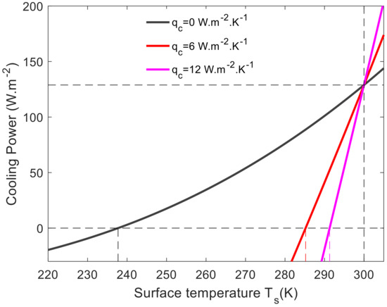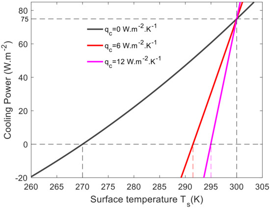 The net daytime cooling performance versus temperature sample with and without the influence of the non-radiative cooling is depicted in Figure 10. By eliminating the non-radiative exchange () at ambient temperature and under direct solar illumination, Figure 10 shows that the proposed cooler design can achieve a net-cooling power over compared to that of porous alumina [38]. In addition, the daytime cooling performance can attain a very low equilibrium temperature of , which leads to a maximum temperature cooling reduction of . For two other different coefficients of conduction and convection a significant temperature reduction can still be achieved. The proposed cooler design can reach an equilibrium temperature of and at and respectively.