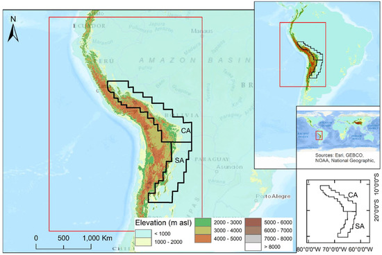 Topographic overview of the Andes range. CA represents the Central Andes, and SA represents the Southern Andes.