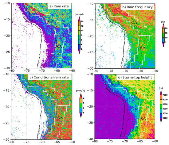 Figure 2 shows the horizontal distribution of rain characteristics, including rain rate, (Figure 2a), rain frequency (Figure 2b), conditional rain rate (Figure 2c), and storm-top height (Figure 2d) over the Andes region. Along the eastern slope, south American summer season rainfall reveals a maximum in the CA higher terrain and less over the SA (Figure 2a), congruous with previous observations [16,17,28]. Moist air transport from the tropical Atlantic Ocean by low-level trade wind and orographic effect on well-known SALLJ is primarily associated with that large rainfall amount over the tropical Andes [16,35,45,46,47]. The eastern flanks of the tropical Andes―narrow zones between 500 m and 2000 m AMSL in elevation adjacent to the wet Amazon basin―experience a large amount of rain rates >10 mm/day (Figure 2a). Bookhagen and Strecker [17] found that rain peaks are dominant at a mean elevation of 1.3 km along the entire Andes. Recently, rainfall hotspots have been observed at terrain elevation of around 1000 m AMSL along the eastern slope of southern Andes [12,16]. They have also identified a major rainfall hotspot with two narrow parallel bands formed 30 km apart in the region between 13° S and 14° S. The first band appeared at the 1000 m AMSL, while the second (stronger) was centered in the plains. Moreover, the terrain above 2000 m and the Altiplano (Andean Plateau) obtain less rain. Whereas in contrast to Himalayan rainfall distribution, there is no continuous double band rainfall in the Andes. As this region does not possess continuous two-step topography [4,17].