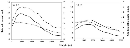 Variation of rainfall characteristics with elevation for (a) Central Andes (CA) and (b) Southern Andes (SA). Solid, dotted, and dashed lines represent daily rainfall total (mm/d), conditional rain rate (mm/h), and frequency of rainfall (%).