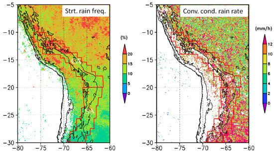 Figure 4 shows the rain-type distribution during austral summer over the Andes. Precipitation systems are mostly stratiform over the CA, whereas these systems are more convective over the SA regions (Figure not shown). Interestingly, the spatial distribution of frequency and intensity of both rainfall types are identical, with higher frequency over the CA region and higher intensity over the SA region.
