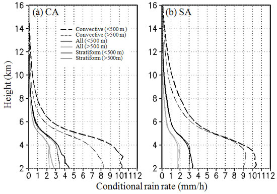 Figure 5 illustrates the vertical profile of the conditional rain rate of all rain types over the Andes. In both the CA and SA regions, we inspected vertical rain rates above and below 500 m AMSL separately to explore rainfall-elevation relationships more precisely. Below 4 km, the rain rate is greater over the lower terrain (<500 m AMSL) than the higher terrain for both CA and SA regions. However, the differences are larger in the CA. At a high altitude above 6 km, the rain rate in the SA is greater than the rain rate in the CA, which implies that intense convection controls more in the SA. This is in agreement with the findings demonstrated by Romatschke and Houze Jr [28]. The rainfall comes mainly from small but intense convective systems in the SA, which are likely to occur during the day time. At lower elevations areas in the SA (below 3 km), the convective rain rates decrease, suggesting the higher occurrences of evaporation in the SA.