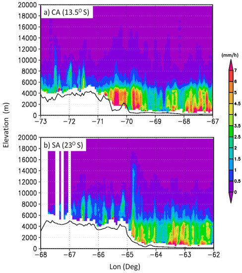 Figure 6 shows the vertical profile of the rain rate along the E-W cross-section of the CA (13.5° S) and SA (23° S). The storm top reached above 14 km over the higher terrain with an intense rain rate in the lower precipitation column over the CA. Thus, large amounts of rain found in higher terrain are linked with deep convection. This distinctive feature differs from that observed over the central Himalayas [4], where maximum rainfall over the higher terrain is linked with shallow convection during summer. The storm top was even higher (above 16 km) over the higher terrain of the SA, but the rain in the lower column is not intense as it is seen in CA. Such patterns in storm height advocate extremely deep convections. A similar characteristic was noticed in the northwestern Himalayas [40].