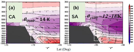 Convective activity associated with orographic lifting is an important factor in rainfall over mountains [48,49]. Thus, analysis of atmospheric stability is important to understand the underlying precipitation mechanisms over the mountainous region [37]. Here, we analyzed climatological variables (temperature, moisture, and wind) obtained from JRA-55 reanalysis data. As previous studies by Shrestha and Deshar [37] and Shrestha et al. [4], this study also evaluated equivalent potential temperature (θe) over the area of interest (areas in rectangles Figure 6a,b) at different pressure levels (600–925 hPa) to explore the atmospheric instability strength. The vertical structure of the atmosphere, shown in Figure 7a,b, depicts distinct features between the CA and SA regions. A strong, low-level, northwesterly wind flow and relatively high θe are apparent over the CA region compared to the SA. The smaller vertical gradient in θe (~14 K) informs relatively stable atmospheric conditions over the CA, whereas a strong convective instability is apparent over the SA with comparatively higher θe (12–18 K). The horizontal wind indicates distinctive features between the lower and higher elevations, i.e., low-level northeasterly moist flow from the wet Amazon basin and strong westerly wind flow in the upper atmosphere. These tendencies are favorable to deep convection associated to well-known capping mechanisms, as described previously by Romatschke and Houze Jr [28].
