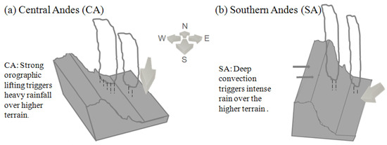 Schematic representations of austral summer precipitation patterns for (a) Central Andes (CA) and (b) Southern Andes (SA).