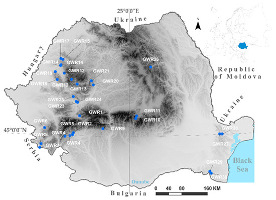 A total of 30 springs of karstic origin, located throughout the Romanian territory (Figure 1), were selected for this study. All of the selected springs are used for domestic and agricultural purposes by their local rural communities.