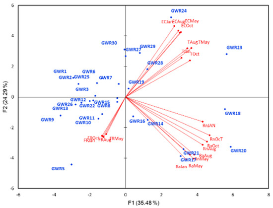 No correlation between the radon or radium activity concentrations and the measured physicochemical parameters was found in the PCA (Figure 2). Radon and radium are separated in a different quadrant from the flow rate, while temperature and electrical conductivity are grouped together. Very few springs are defined by temperature and conductivity (GWR23), flow rate (GWR5), or radon and radium (GWR20). Most of the springs are negatively correlated with radon and radium, especially along the F1 axis.