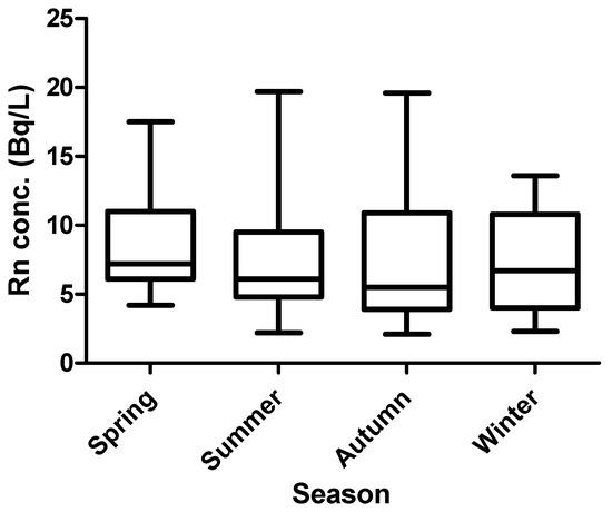 A similar statistical analysis was applied to radium measurements. Thus, a log-normal distribution was obtained for the four seasons but not for the annual computed means. The seasonal geometric means range from 1.03 Bq/L (Summer–August) to 1.15 Bq/L (Winter–January). A statistically significant difference was obtained by applying the ANOVA test for repeated measures and Tukey’s post hoc analysis to the radium concentrations during the hot (summer) and cold (winter) seasons (p = 0.02).