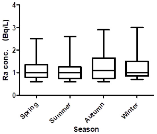 Seasonal (season) distribution of radium concentration (Bq/L) in karstic springs.