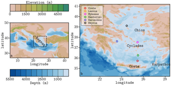 - Kotroni, V.; Lagouvardos, K.; Lalas, D. The Effect of the Island of Crete on the Etesian Winds over the Aegean Sea. Q. J. R. Meteorol. Soc. 2001, 127, 1917–1937. [Google Scholar] [CrossRef]