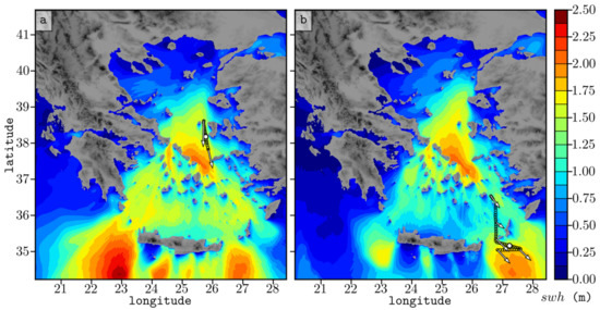 The wave conditions during the AG campaign calculated by SWAN were determined by the Etesians. As displayed in Figure 2, both days exhibit similar wave condition; low values (<1 m) are found at the northern and northwestern part of the Aegean due to low winds and limited fetch, within the Cyclades complex due to wave blocking and spreading, and at the deceleration zone just north of Crete [30]. High values (>1.75 m) are found downstream of Chios and just north of the Cyclades region, downstream of the Kythira and Crete straits (southwest of Crete), and at the southeast of Crete, and associated with flow acceleration due to channeling effects between Crete and Karpathos islands [64].