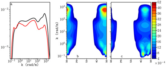(a) Azimuthally integrated saturation spectrum of the directional spectrum at the east-central Aegean (black line) and at the southeast Aegean (red line). Directional saturation spectrum from flight segments, (b) west of Chios (Figure 2a, black and white circle) and (c) south of Karpathos (Figure 2b, black and white circle).