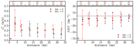 (a) Mean and standard deviation of measured (in bins of 5 km) as a function of upwind shore distance, for negative (black circles) and positive (red squares) potential virtual temperature differences between the sea surface and the air, . The number of samples (>5) per bin is shown over the plot. (b) As in Figure 4a, but for the sensible heat flux .