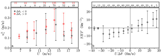 (a) Median and median absolute deviation of measured as a function of wind velocity (in bins of 2 m/s). The black circles and red squares refer to samples with negative and positive potential virtual temperature differences between the sea surface and the air, . The number of samples (>5) per bin is shown over the plot. (b) Median and median absolute deviation of measured as a function of , the product of wind velocity, and potential temperature difference, (in bins of 5 Km/s).