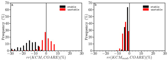 (a) Frequency distribution (%) of the symmetrically normalized relative residuals of simulated surface friction velocity with KCM and COARE algorithms, (COARE-KCM)(COARE KCM)1/2. The data are divided based on the bulk atmospheric stability; black (red) bars represent samples under near-neutral to stable (near-neutral to unstable) conditions. (b) As in Figure 6a, but for the modified version KCMmod.