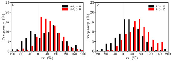 The moderate to high wind group ( < 15 m/s) displays good performance in terms of simulation efficiency, and the simulated differ less than 40% (|| < 40%) compared to the observations, with a cumulative frequency of occurrence near 50% (Figure 7b). For the group with the stronger winds ( > 15 m/s), simulations significantly overestimate the measurements and the distribution exhibits a displaced residual peak value found in the interval of 60% to 80% [77], demonstrating that COARE performed better under strong winds than under weak winds. In our case, the stronger winds are related to the presence of LLJ and the measured wind speed is higher than predicted from the similarity profile.