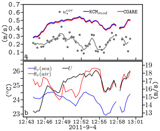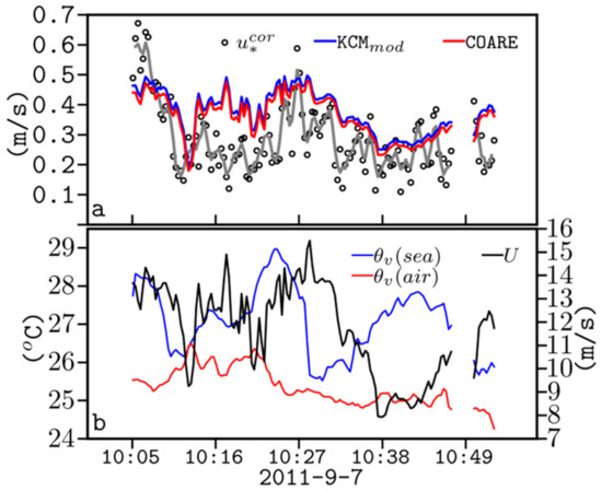 (a) Time-series (UTC time) of observed height-corrected friction velocity (black circles) and smoothed (grey line). Estimated surface friction velocity , by KCMmod (blue line) and COARE (red line). (b) Time-series of observed meteorological variables, potential virtual temperature of sea surface (blue line), and air (red line) and wind speed (black line). The flight segment is at the east-central AS, on 7 September 2011 (as displayed in Figure 2a).