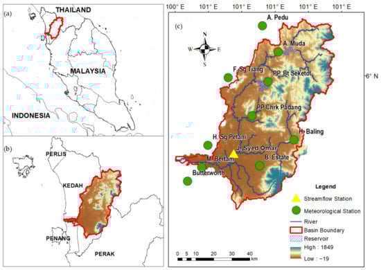 (a) Peninsular Malaysia, (b) location of the MRB in the northern region of Peninsular Malaysia, and (c) the streamflow station and distribution of meteorological stations in the MRB.
