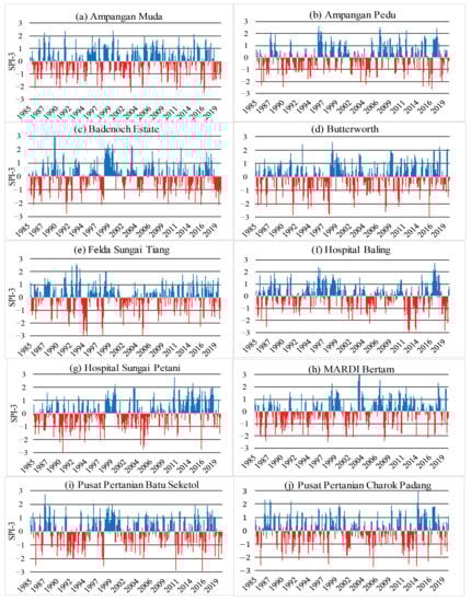 Temporal changes in SPI-3 at the (a) Ampangan Muda, (b) Ampangan Pedu, (c) Badenoch Estate, (d) Butterworth, (e) Felda Sungai Tiang, (f) Hospital Baling, (g) Hospital Sungai Petani, (h) MARDI Bertam, (i) Pusat Pertanian Charok Padang, and (j) Pusat Pertanian Batu Seketol stations from 1985 to 2019.
