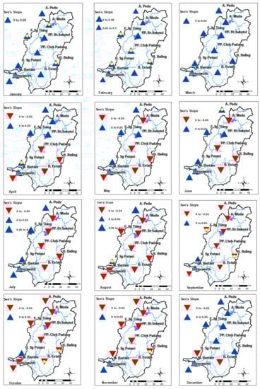 A significant increasing trend in SPI-3 was found at numerous stations in January, February, April, June, and August at a 95% confidence level (Figure 3). For example, the Felda Sungai Tiang station showed a significantly increasing trend in the SPI in January and February. Meanwhile, the Hospital Sungai Petani station demonstrated a significantly increasing trend in February, April, and August, with the magnitudes 0.041, 0.037, and 0.045, respectively. The Hospital Baling and Ampangan Muda stations also showed a significantly increasing trend in January, with SPI magnitude changes of 0.04. Moreover, the MARDI Bertam (0.040) and Pusat Pertanian Charok Padang (0.029) stations had a significantly increasing trend of SPI-3 in February. Most of the stations showed an increasing trend in SPI-3 from January to March. The findings are consistent with the monthly rainfall trend analysis conducted by Tan et al. [52] over the MRB, where increases in monthly rainfall were mainly found during the low-precipitation period, such as January, February, April, and December.