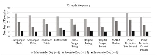 The area near the dams has been exposed to intense droughts in the past few decades. For instance, the Ampangan Muda and Pusat Pertanian Batu Seketol stations had the highest frequency of extremely dry drought. Human activities might have influenced the dry condition. For example, deforestation decreased the amount of transpiration, hence decreasing the amount of rainfall in that area [62]. All elements endangering the forest can be present where the evaporation rate is higher after deforestation, leading to longer droughts and higher temperatures These issues can lead to water shortage problems in the region, resulting in a water crisis, especially in Penang, which highly depends on the freshwater supply from the Muda River. As one of the most developed states in Malaysia, for Penang, water is extremely important to sustain industries and local households. Therefore, local authorities should promote water awareness and rainwater-harvesting activities to reduce the consumption of treated water in Penang.