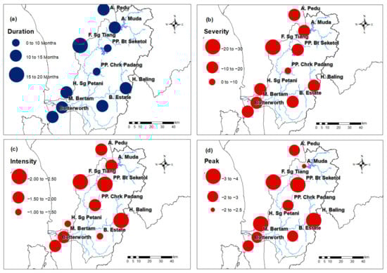 Figure 5 indicates the drought characteristics, such as duration, peak, severity, and intensity, in the MRB from 1985 to 2019. The Pusat Pertanian Charok Padang station had the shortest maximum drought period, which was recorded in 2006. Several drought events occurred over more than 10 months, e.g., at the Ampangan Pedu, Butterworth, Felda Sungai Tiang, and Hospital Sungai Petani stations. Meteorological droughts in tropical basins are relatively short, lasting for 3 months [3]. Furthermore, any drought condition in Malaysia need 2 to 3 months to recover into a non-drought condition [53]. However, this study showed that extreme drought events in the MRB can still last up to 18 months. For instance, the Pusat Pertanian Batu Seketol and Pusat Pertanian Charok Padang stations had a maximum drought duration of 10 months, whereas the Felda Sungai Tiang station recorded the longest drought duration of 18 months in 2001/2003.