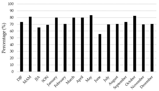 Figure 6 presents the response rate of streamflow to precipitation at seasonal and monthly scales for the 1985–2019 period. A moderate response rate was recorded in June of 55.6%, while May and October had the highest response rate recorded during these months. A moderate seasonal response rate was found in June to August (JJA) (65.5%) and September to November (SON) (69.2%). In contrast, the DJF and MAM seasons showed a stronger connection between the SSI and the SPI compared to JJA and SON. A response rate of more than 80% was found in January, March to May, and October, showing that rainfall has a larger influence on streamflow in these periods. As the drought in the MRB normally occurs during March to May, the finding shows that rainfall plays a major role in freshwater supplies during the dry period.