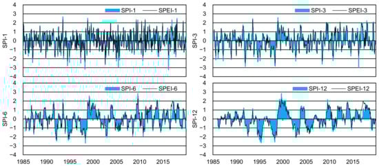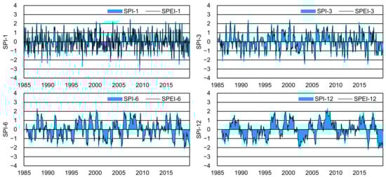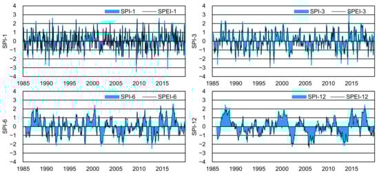 Comparison of the SPI and SPEI at 1-, 3-, 6-, and 12-month timescales at the Butterworth station from 1985 to 2019.