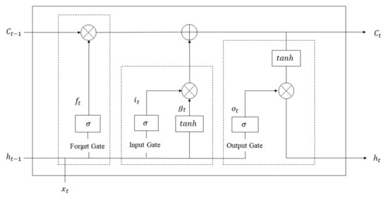 RNNs can process time series data by using neurons with their own feedback. However, as the time series grows, the residual error that RNN needs to return decreases exponentially, resulting in slow update of network weights and the problem of gradient disappearance or gradient explosion. Hochreiter et al. proposed a long-term and short-term neural network [15], replacing the traditional hidden layer with the LSTM layer, which can obtain both the cell state and the hidden layer state from the previous moment. LSTM adopts a control gate mechanism, which is composed of memory cells, input gates, output gates, and forget gates. Its unit structure is shown in Figure 1.