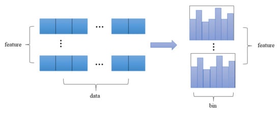 The histogram algorithm [17] greatly improves the efficiency of the LightGBM model, which can discretize the feature sequence and directly support the native support category. It is not necessary to use similar one-hot encoding for feature digitization, as is the case in XGBoost, and transform it into a multidimensional 0/1 feature, which is not efficient in space and time. The histogram algorithm discretizes the floating-point eigenvalues into m integers and builds a histogram with a width of m, as shown in Figure 2 (right). When traversing the data, the discretized value is used as an index to accumulate statistics in the histogram. Once the data are traversed, the histogram will accumulate the required statistics. According to the discrete value of the histogram, the optimal segmentation point is found. Compared with GBDT, traversing all possible segmentation points of each feature to find the optimal segmentation point, LightGBM requires a much smaller memory and greatly improves the speed. The algorithm is shown in Figure 2 [18].