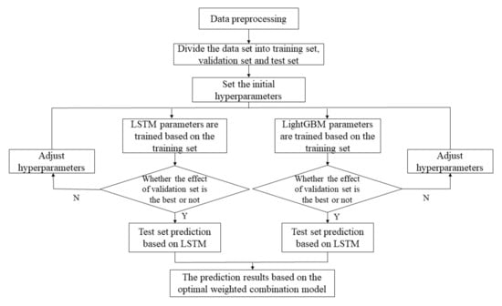 LSTM and LightGBM are two completely different models. The former is sensitive to the nature of time series, while the latter has a stronger ability to extract features than the former. There are differences in the predictive abilities of these two models. However, a model with a poor overall forecasting effect does not mean that the model has a bad forecasting ability for all samples. In view of the different advantages of the two models in terms of processing data, this paper combines the models through the optimal weighted combination method, which avoids the overall disadvantage of a single model and improves the stability of the model’s performance. The calculation steps of the optimal weighted combination method follow:
