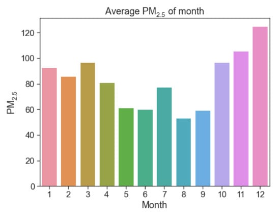 It can be seen in Figure 6 and Figure 7 that there are differences in PM2.5 at different hours, but it maintains a steady upward or downward trend in similar hours. The PM2.5 concentration is higher in winter, November, and March, and the PM2.5 concentration in summer is significantly lower than the other three seasons. The seasonal concentrations of PM2.5 from high to low follow: winter > autumn > spring > summer. The average concentration of PM2.5 was the highest in December. Because of the severe cold in winter, household coal-fired and carbon-fired heating increase, leading to an increase of pollutants in the air. The trend of PM2.5 concentration in summer and spring is similar. The average concentration of PM2.5 was lowest in August. PM2.5 is higher than other periods from 8 a.m. to 12 a.m., which is caused by the morning peak and factory work; PM2.5 decreases in the afternoon because the temperature at this time limits formation of an inversion layer, which provides greater air circulation and pollutant diffusion; PM2.5 levels increase after 5 p.m. during off-peak hours due to vehicle emissions.
