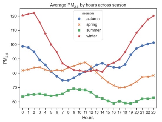 Average PM2.5 concentration per hour in different seasons.