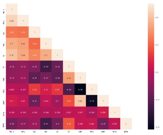 PM2.5 is a kind of particulate matter affected by other particles in the air and meteorological conditions. The thermal distribution diagram of the correlation between the hourly PM2.5 other air particles and meteorological factors from 1 January 2014 to 28 February 2017 are shown in Figure 8. There is a correlation between them. The other particulate matter in the air has a strong correlation with PM2.5, and meteorological conditions have a weak correlation with PM2.5. Different particulate matter and meteorological conditions have varying degrees of impact on PM2.5.