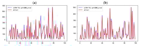 LSTM-TSLightGBM prediction results: (a) 100 random samples in the first 50% of the test set, (b) 100 random samples in the last 50% of the test set.