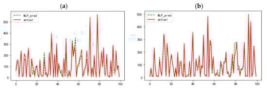 To more intuitively judge the superiority of the LSTM-TSLightGBM performance, it is necessary to further combine graphics to judge its performance. Considering that the effect of graphic display is not obvious when the difference degree of MAE is within 1, this section only shows the comparison curve between the predicted value and the real value of LSTM-TSLightGBM model with the best performance and the MLP model with the worst performance. Due to the large sample size of the test set, all visualization will affect the judgment effect. Here, 100 samples are drawn from the first and second halves of the test set for comparison. The visualization results are shown in Figure 10 and Figure 11.