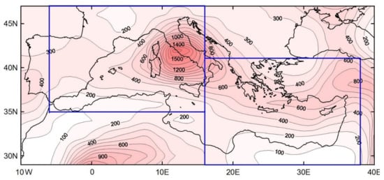 The most active cyclogenesis areas over the Mediterranean region, according to [3,4,5,6], are located mostly along the northern coast in winter (e.g., the Gulf of Genoa/Ligurian Sea, Aegean Sea, Black Sea, Balearic Sea, Gulf of Lyon, Adriatic Sea, Ionic Sea, Crete) and along the southern, western, and eastern coasts in summer (e.g., Iberian Peninsula, the southern slopes of the Atlas Mountains, Gulf of Gabes, Gulf of Sidra, Cyprus). Explosive cyclones tend to form in the Western Mediterranean, though their scale and depth is greater in the Eastern Mediterranean [7].