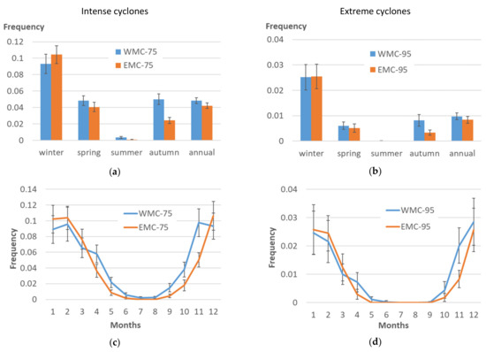 Seasonal/annual (a,b) and monthly (c,d) averages of the frequency of intense/extreme cyclones over the Western and Eastern Mediterranean (WMC-75/WMC-95 and EMC-75/EMC-95, respectively): (a,c) intense cyclones; (b,d) extreme cyclones. Error bars correspond to the 95% confidence level.