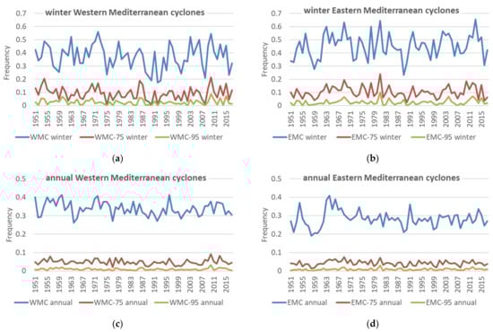 Time plots of the frequency of total number/intense/extreme cyclones over the Western and Eastern Mediterranean (WMC/WMC-75/WMC-95 and EMC/EMC-75/EMC-95, respectively): (a,b) winter averages; (c,d) annual averages.