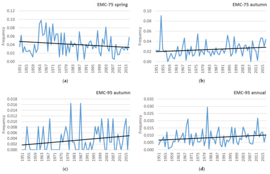 Time plots and linear trends (straight black lines) of standardized anomalies of the frequency of intense/extreme cyclones over the Eastern Mediterranean (EMC-75/EMC-95): (a) spring intense cyclones; (b) autumn intense cyclones; (c) autumn extreme cyclones; (d) annual extreme cyclones.