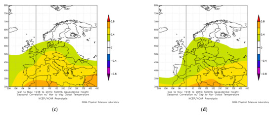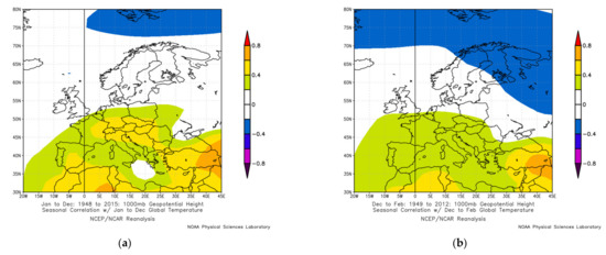 Linear trends of the 67-year series can be interpreted both as manifestations of the global temperature rise, and as part of a lower-frequency variability with periods comparable to or exceeding the length of the series. Actually, any climate series is the result of both factors, and the problem of separating the anthropogenic and natural components of climate change and variability has not been solved yet. As the natural factors, we consider 60–80-year climate variability associated with the multidecadal processes in the North Atlantic and North Pacific (AMO and PDO). As for the global temperature rise, there are regional features, and regional climate anomalies may not correspond to the global trend [81]. For example, Figure 6 shows spatial correlations between global temperature and 1000 hPa geopotential height over Europe for seasonal and annual series. According to Figure 6, the correlation coefficients were higher over the Eastern Mediterranean than over the Western Mediterranean. This may be explained by the decreasing influence of the ocean (from west to east) that engulfs the surface temperature rise [82] and by the increasing influence of the continents over which the maximum temperature rise is observed [81].