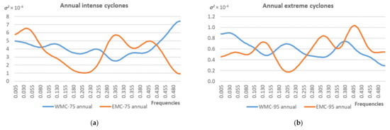 Averaged periodograms of annual (a,b) and seasonal (c–f) values of the frequency of intense/extreme cyclones over the Western and Eastern Mediterranean (WMC-75/WMC-95 and EMC-75/EMC-95, respectively): (a,c,e) intense cyclones; (b,d,f) extreme cyclones.