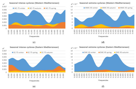 Annual spectra of intense and extreme cyclones over the Eastern Mediterranean had higher levels of energy at peaks of about 2–2.5 years (0.305–0.405 units of spectral frequencies) compared with those over the Western Mediterranean and lower levels of energy at peaks of about 3 years (0.205 units of spectral frequency) (Figure 7a,b). As for the seasons, most of the energy was concentrated in winter spectra (Figure 7c–f); spring and autumn were characterized by comparable levels of energy, a little higher in autumn for the Western Mediterranean (Figure 7c,d) and in spring for the Eastern Mediterranean (Figure 7e,f).